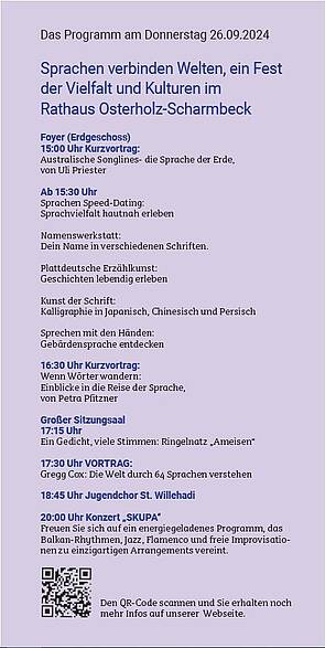 Neben einem Sprachen-Speed-Dating, Plattdeutscher Erzählkunst, australischen Songlines und einem Exkurs in die Kalligraphie, Kurzvorträgen und Gedichtvorträgen wird es einen Vortrag von Gregg Cox geben, der bis zu 64 Sprachen spricht.
